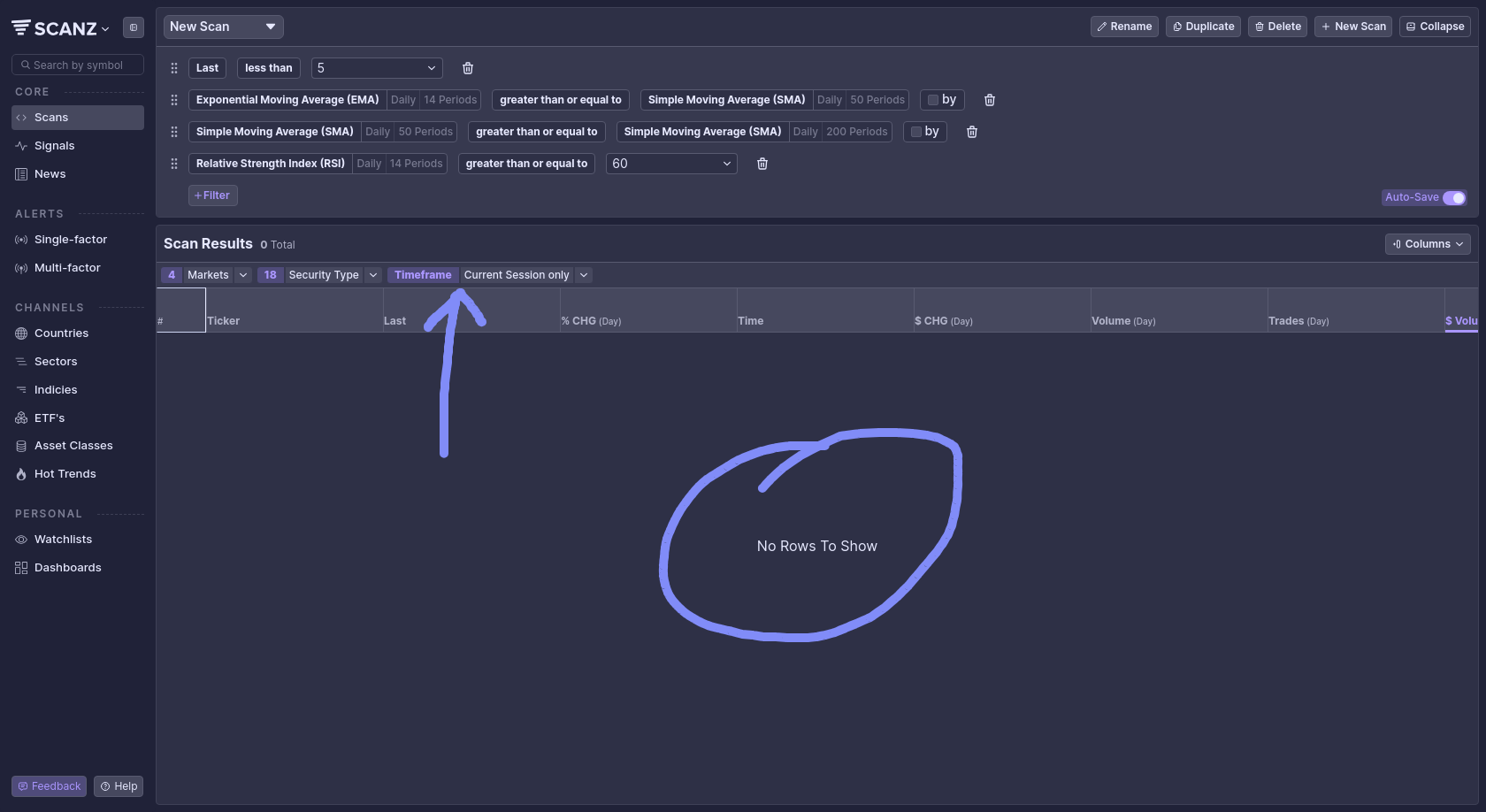 Add Last Session to Timeframe, so that it is possible to scan based on last session. This is particularly useful when scanning over the week-end or on a holiday, when markets are closed. This is usually when one has time to spare, and it is a great time to do a full market scan. Desktop version works like that and on a market closed day, will show last session data; web version currently does not show anything on a market closed day.